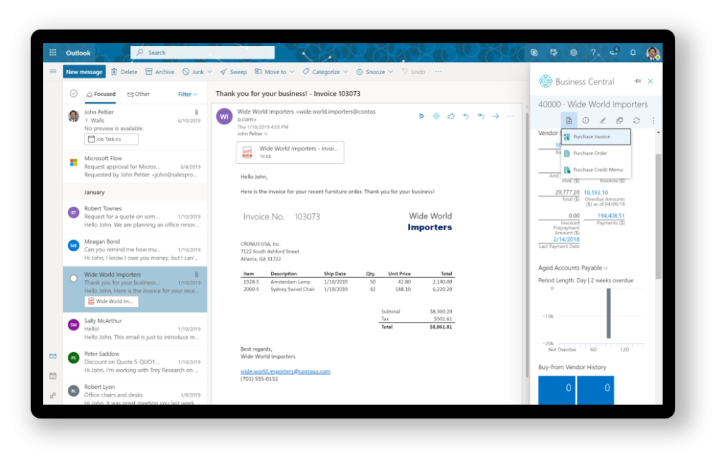 Interact with customers and vendors directly from Outlook to accelerate transactions and business decisions